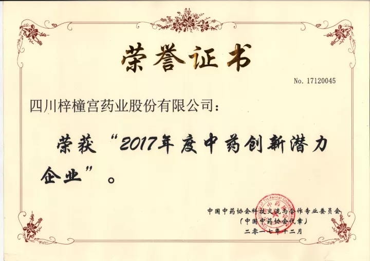 15 17-12熱烈慶祝四川梓橦宮藥業股份有限公司榮獲“2017年度中藥創新潛力企業”,并入選《中國中藥企業科技創新優秀案例》和《2017年中藥企業科技創新文件匯編》!